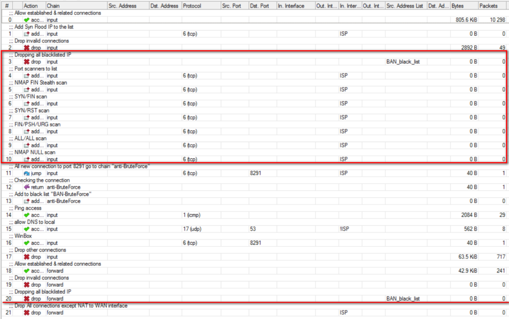 Давайте немного модифицируем нашу конфигурацию firewall, что позволит защитить MikroTik от сканирования портов. Сканирование портов – это попытки подключиться на разные порты с целью определения их доступности.