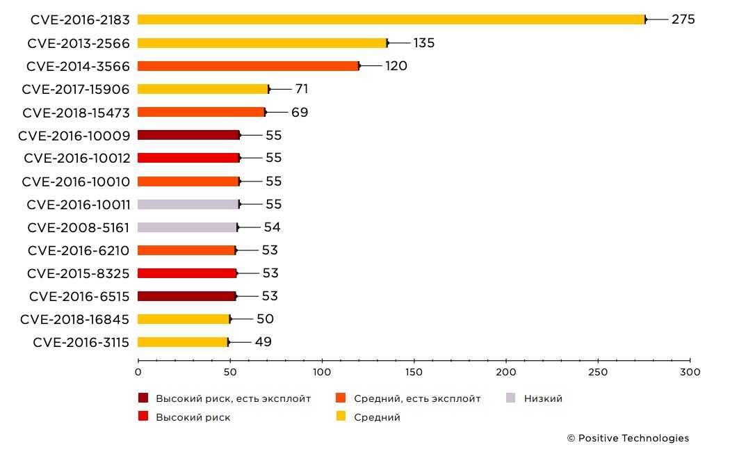 Рисунок 7. Самые распространенные уязвимости на сетевом периметре (количество узлов)