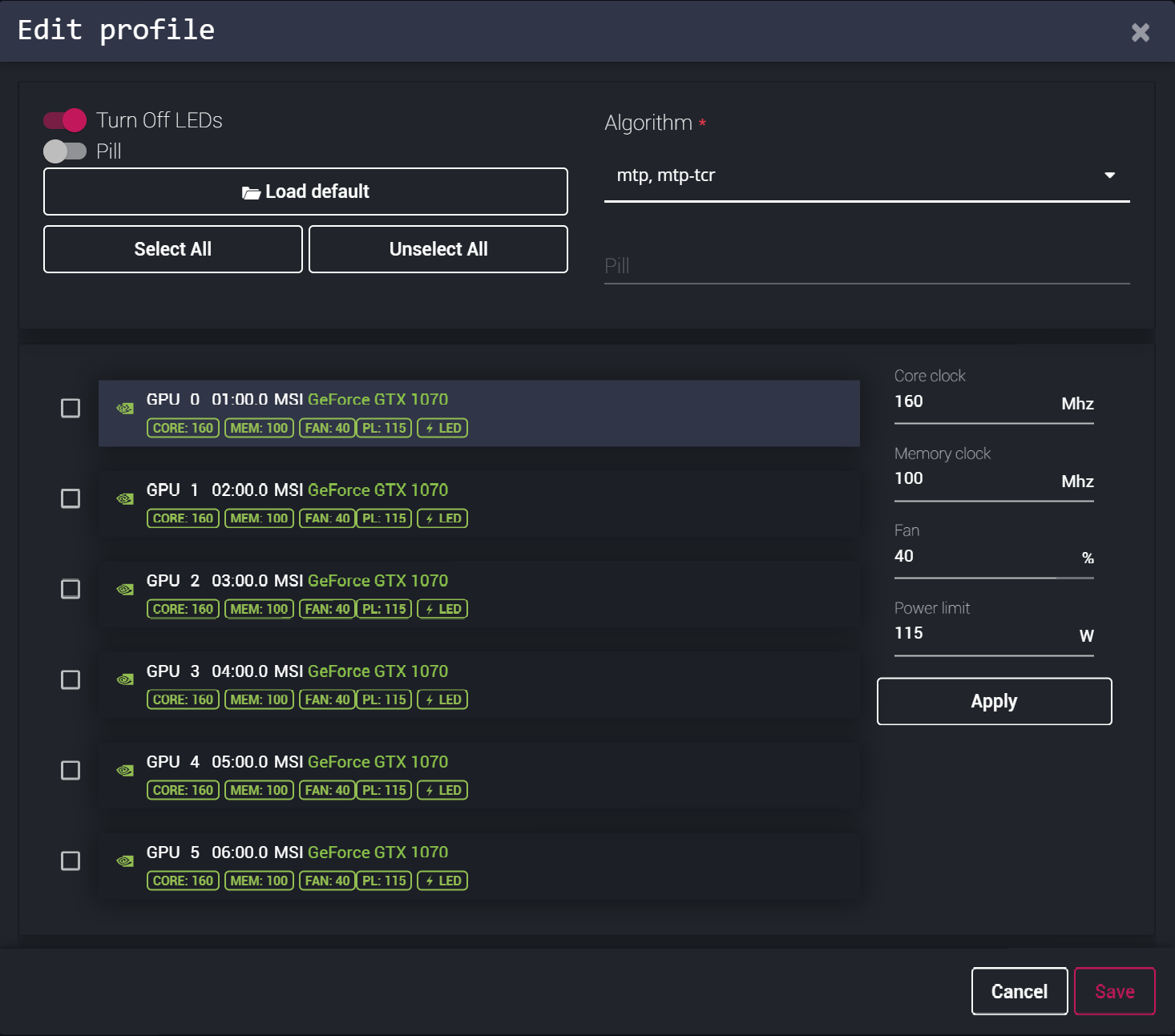 Каждую видекарту можно настроить отдельно, либо выбрать нужные карты при помощи чекбокса (слева от названия карты) и применить настройки одним кликом нажав на кнопку Apply. После настройки нажмите на кнопку Save, чтоб сохранить информацию и закрыть диалог. Когда вы включите майнинг, то система определит алгоритм вашей монеты и применит соответствующий разгон.