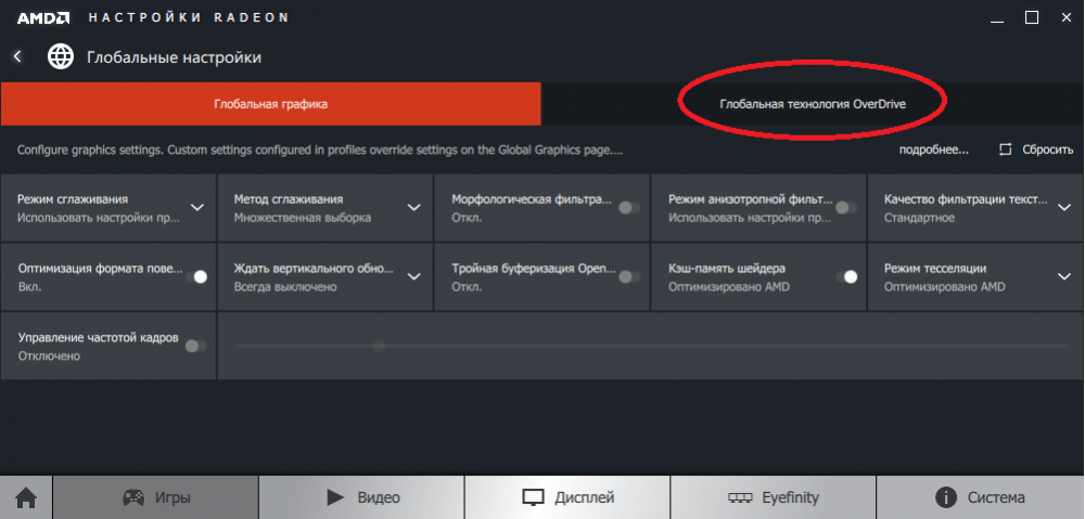 Через Глобальные настройки перейдите ко вкладке Глобальная технология OverDrive.