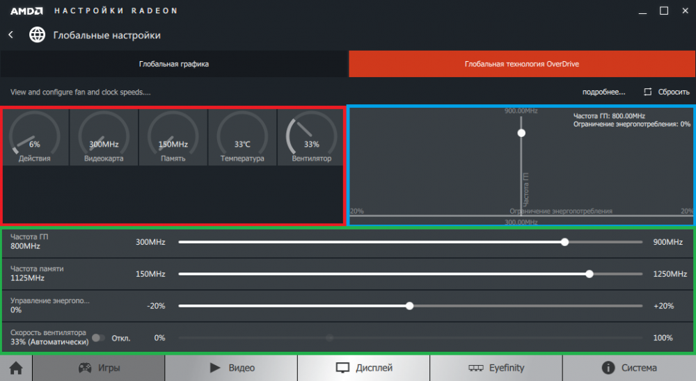 Здесь мы видим несколько областей с ползунками и датчиками: Красная область : датчики, отображающие скорость вентилятора, нагрузку на видеокарту, температуру ГП и количество используемой памяти. Синяя область : графическое отображение энергопотребления и используемой частоты ГП. Зеленая область : расширенное представление настроек по регулировке работы графического процессора.