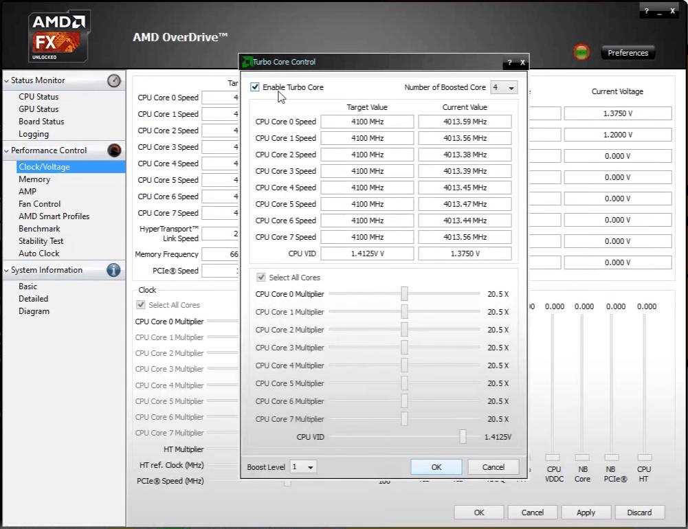 Для пользователей, у которых активирована технология Turbo, следует сначала нажать на кнопку зеленого цвета – “Core Control”. После этого откроется меню, в котором нужно поставить галочку в пункте “Enable Turbo Core”, после чего начать разгон.