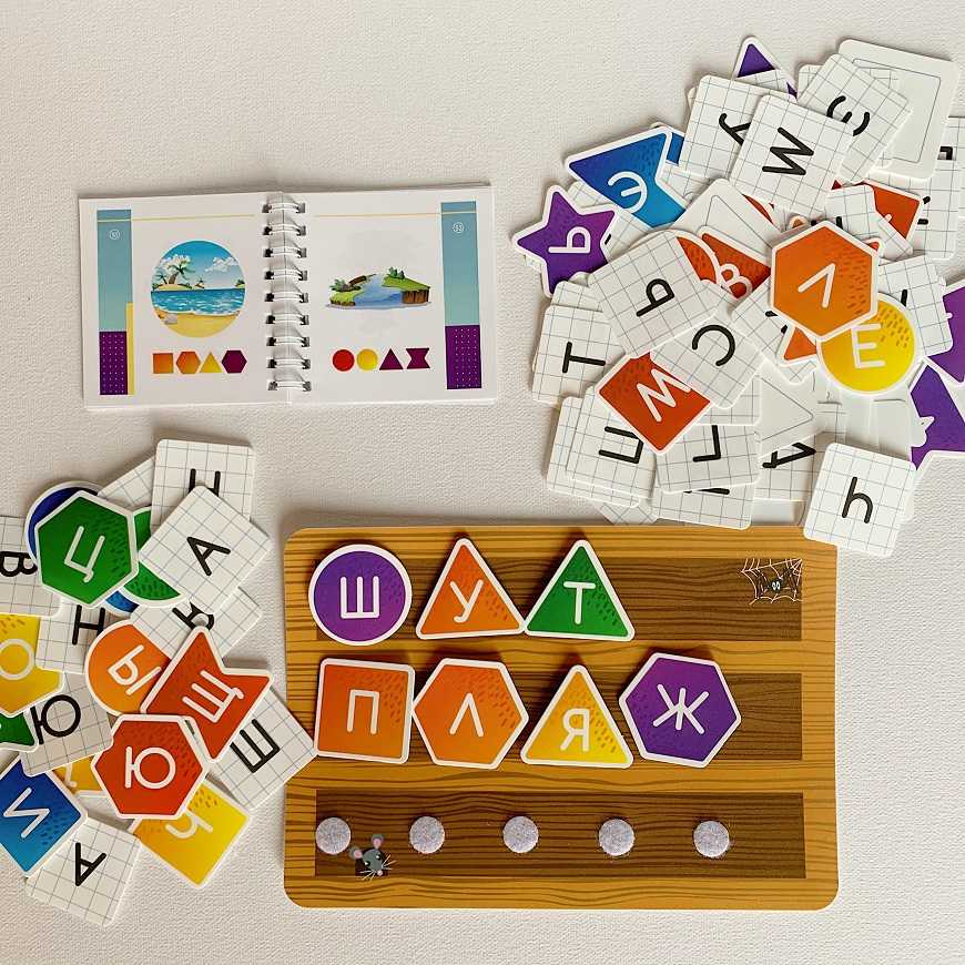В процессе игры ребенок знакомится с такими понятиями, как азбука, буква, гласный и согласный звук, слог, учит геометрические фигуры и цвета. В упаковке вы найдете игровое поле, карточки, элементы на липучках, инструкцию.