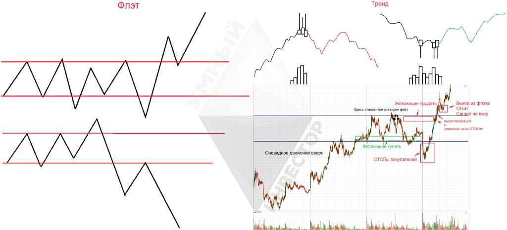 При флетовой динамике, последствия загрузки крупным игроком, сценарий выглядит примерно, как на рисунке ниже. При ситуации же трендового движения, загрузка крупного игрока, выглядит так, как показано на следующей иллюстрации