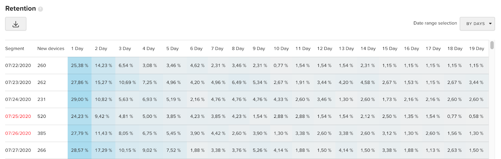 Retention рассчитывается как отношение вернувшихся в приложение пользователей к числу установивших его в определённую дату.