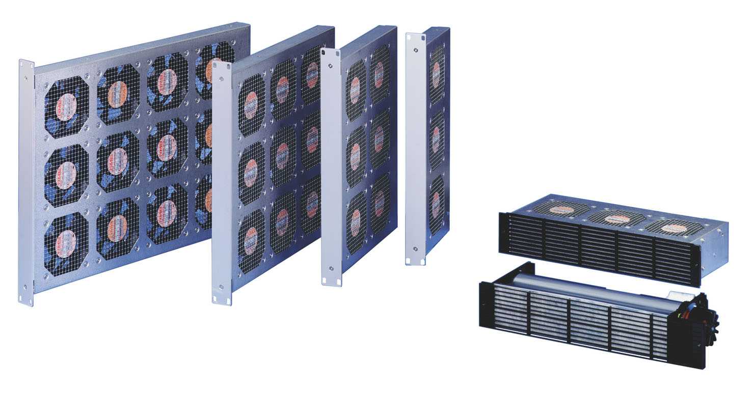 Наиболее распространенной формой охлаждения является принудительное воздушное охлаждение — метод, достаточный для большинства корпусных решений. Здесь естественная конвекция усиливается за счет использования вентиляторов или кассеты вентиляторов (рис. 1). Иногда вентиляторы применяются, если аэродинамическое сопротивление воздуха внутренних компонентов существенно снижает эффективность естественной конвекции. Температура внешней среды, как и в предыдущем случае, должна быть значительно ниже, чем требуемая температура системы. Принудительные методы охлаждения можно разделить на два основных подхода: «на вдув» и «на выдув». При работе «на вдув» вентиляторы располагаются перед компонентами, которые необходимо охлаждать, и толкают воздух по направлению и вдоль нагревающихся элементов. В случае работы «на выдув», напротив, вентиляторы устанавливаются за компонентами, они вытягивают воздух, проходящий вдоль компонентов. Возможно также объединение обоих типов охлаждения. Какое из двух решений эффективнее, определяется исходя из окружающих условий. Если используется вариант «на вдув», в расчет должно быть добавлено тепло, вырабатываемое вентилятором