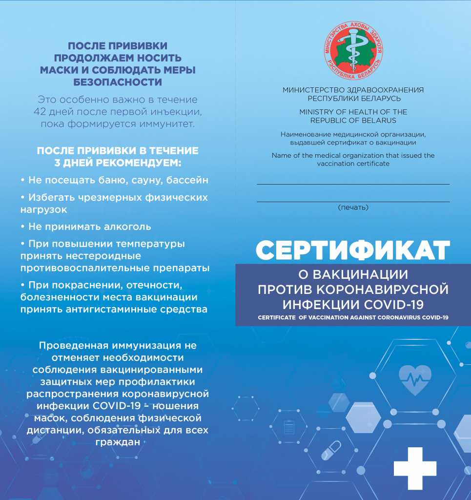 Для выезда за границу сертификаты о вакцинации платно выдает Минздрав Беларуси. В документе указывается название организации здравоохранения и дата рождения привитого. Сертификат заполняют на русском и английском языках.