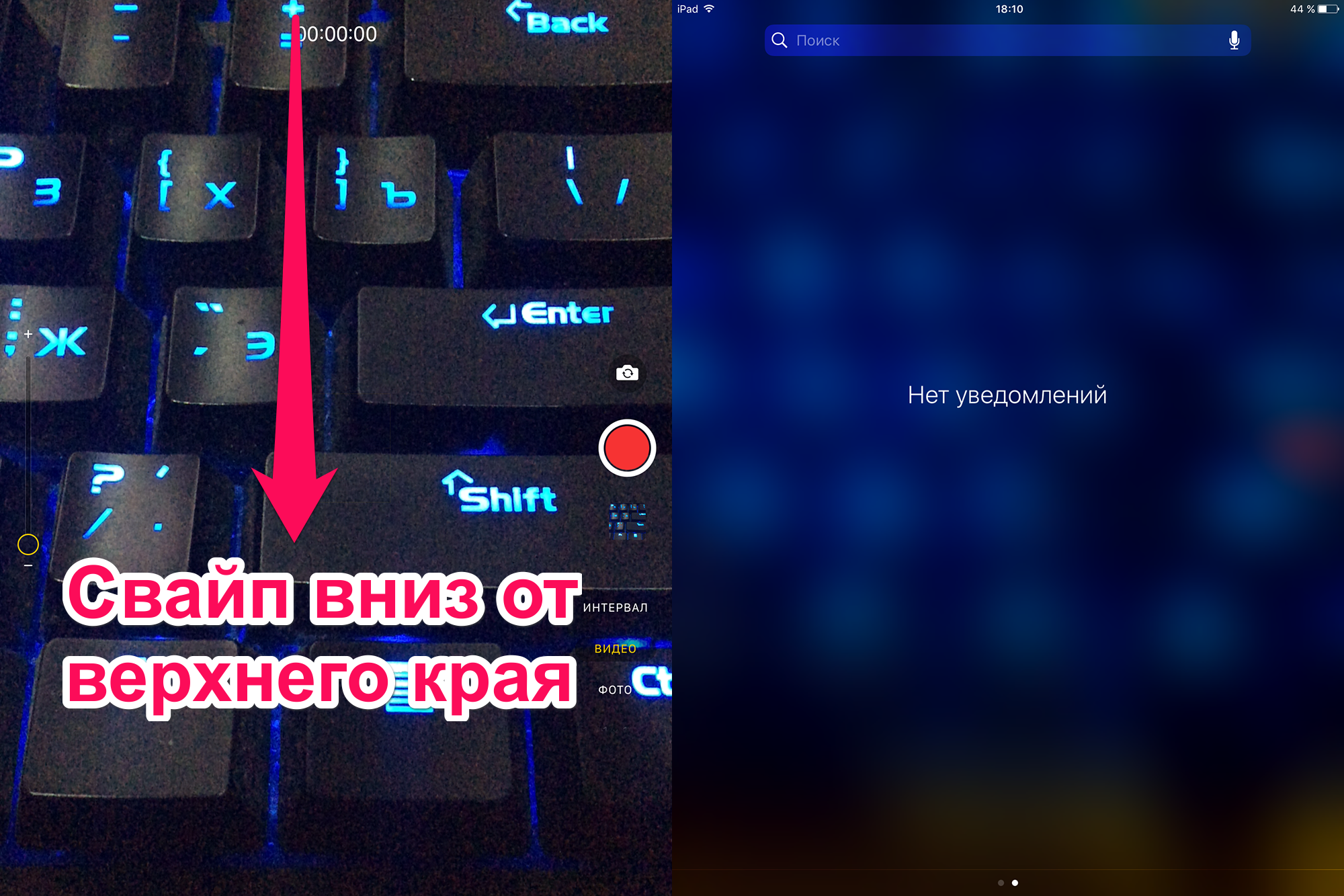 Готово! Съемка продолжится, в то время как на дисплее будет отображаться панель уведомлений. При этом iPhone или iPad не будет автоматически блокироваться спустя указанное в настройках время, поэтому постоянно нажимать на дисплей не придется. Также с Панели уведомлений можно перейти на экран виджетов (сделав свайп вправо) и даже зайти в меню их управления. Съемка из-за этих действий не будет прервана, звук продолжит записываться.