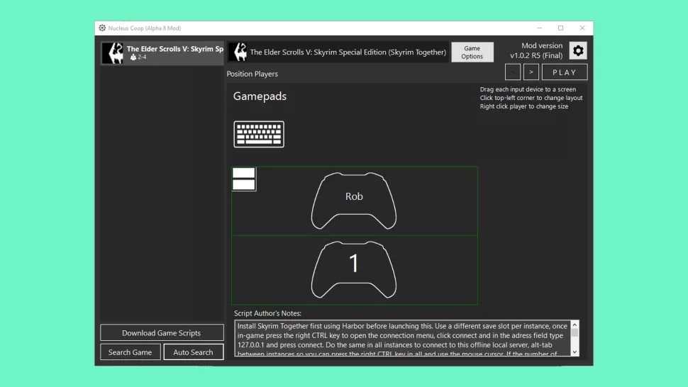 Закройте окно загрузки игровых скриптов, чтобы вернуться на главный экран Nucleus Coop, затем нажмите Skyrim в верхнем левом углу. Нажмите на маленький значок в верхнем левом углу поля под геймпадами, чтобы выбрать, как вы хотите разделить экран.