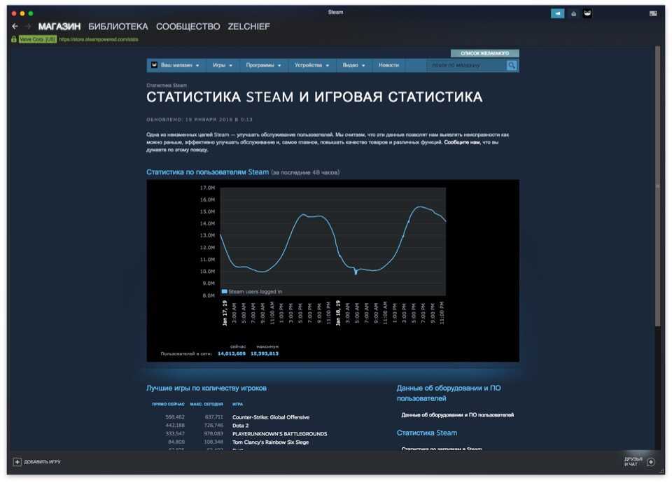 Крупнейший сервис на РС, прошедший путь от небольшого приложения для сопровождения многопользовательских шутеров от Valve (вроде Team Fortress Classic, Counter-Strike и Half-Life 2) в 2003 году до более чем 30 тысяч игр, одного миллиарда аккаунтов и пиком в более 20 миллионов одновременно находящихся в сети пользователей в 2020-м.