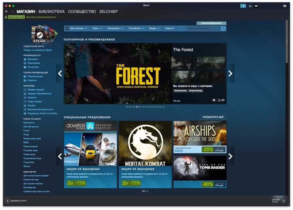 На рисунке 2 показана главная страница магазина Steam. Данная страница является при этом разделом Магазин в любом клиенте Steam. Раздел магазин позволяет просматривать, покупать игры.