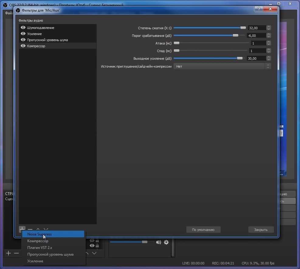 OBS. В программе уже есть встроенные фильтры, которые позволяют избавиться от шумов. Нужно только перейти в «Настройки» (шестерня в микшере возле нашего микрофона) и выбираем «Фильтры». В левом нижнем углу нажимаем на плюс и добавляем «Noise Suppress» — шумоподавление. Также для качественной передачи голоса рекомендуем добавить «Усиление», «Пропускной уровень шума» и «Компрессор» точно в таком порядке. Активируем все перечисленные фильтры и звук становится качественным.