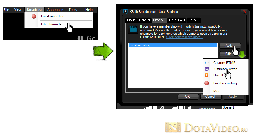 Далее во вкладке Broadcast жмем Edit channels… и в открывшемся окне Add, как показано на изображении: