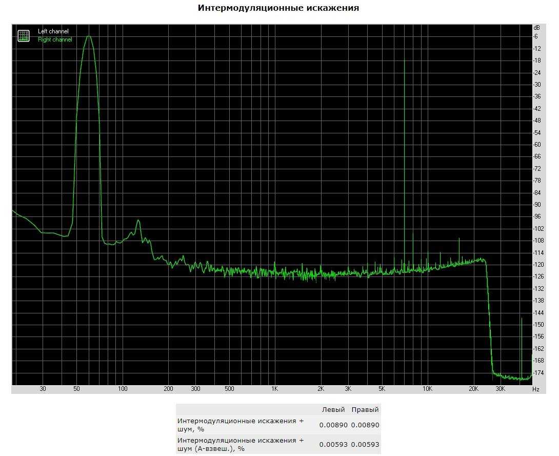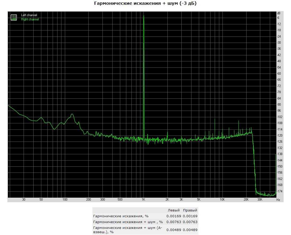 Уровень шумов и коэффициент гармонии на хорошем уровне, он несколько ниже паспортных характеристик, но это нормально для измерений в подобных условиях.