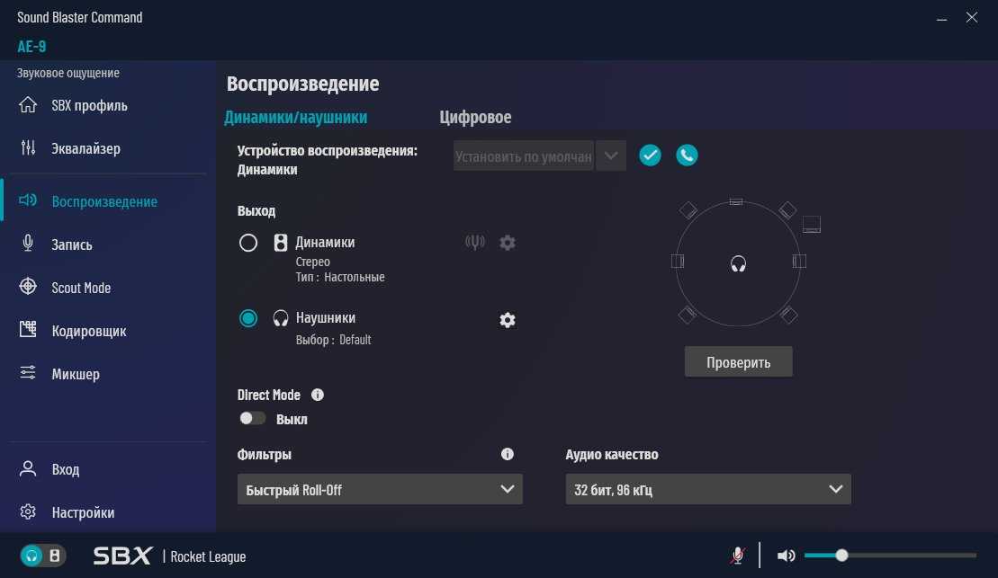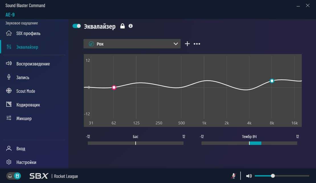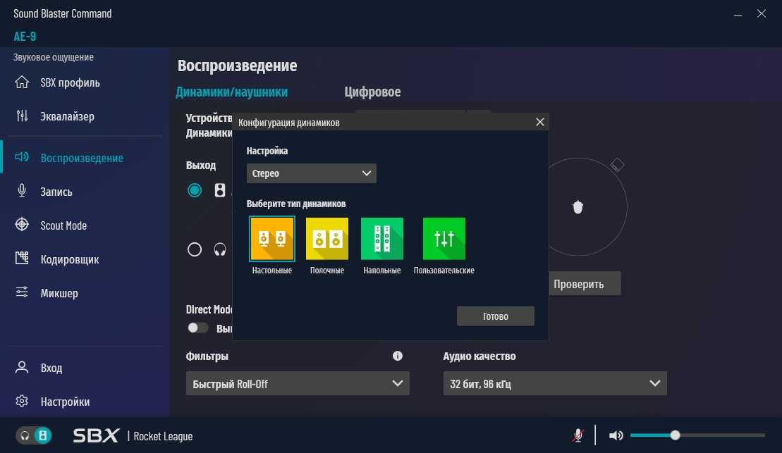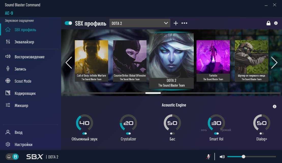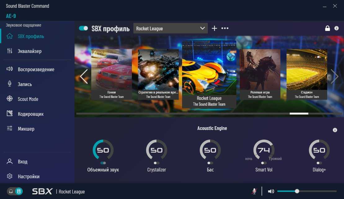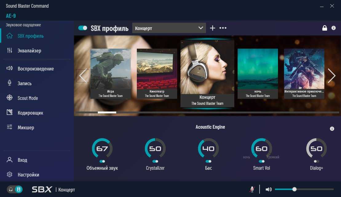 Так в закладке «SBX профиль» уже есть большое количество пресетов, и любой желающий сможет взять и подкрутить их, чтобы настроить звук под свои предпочтения. Вы можете выбрать «концерт» или «кинотеатр», есть настройки специально под большой игровой ряд — в целом, есть, где душе разгуляться.