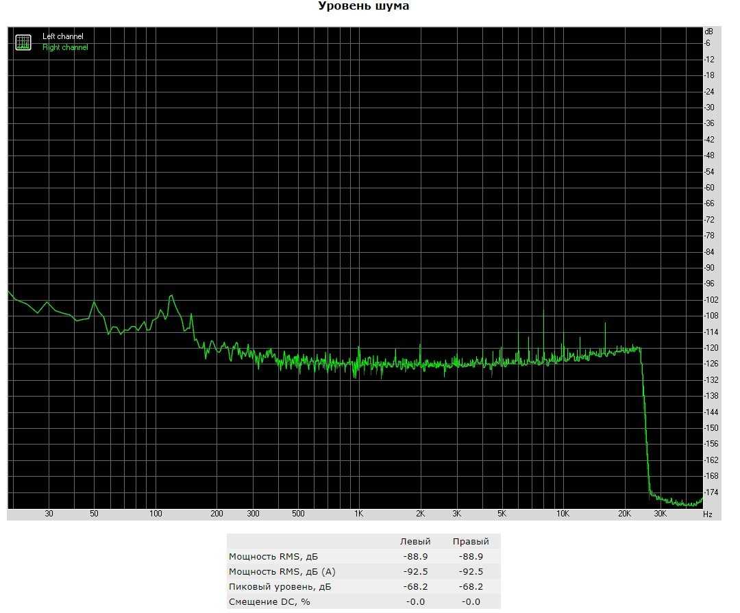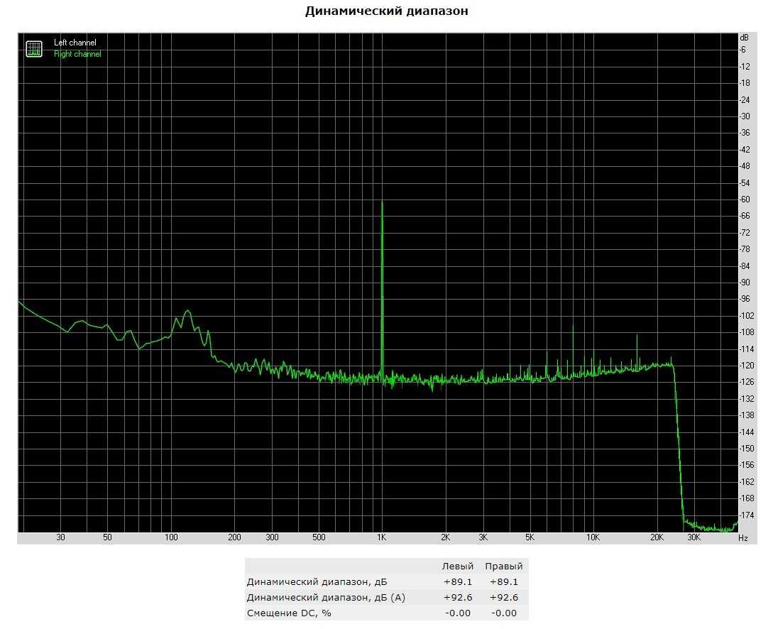 Наиболее качественный тестовый сигнал 1 кГц был получен при уровне громкости на выходе в диапазоне 20-25 %, запись — 80%. В среднем на уровне -120 дБ и с наименьшими помехами. При большей громкости шумы и искажения росли от 10-20 дБ и более.