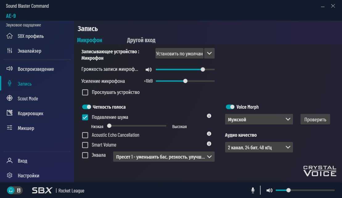 Теперь настало время обратить внимание на то, что представляет собой настоящую ценность для пользователя и называется Crystal Voice: это достаточно умная система снижения уровня шума и постпроцессинга для микрофона. Алгоритмы подавления шумов работают безукоризненно, отсекая подавляющее большинство нежелательных звуков