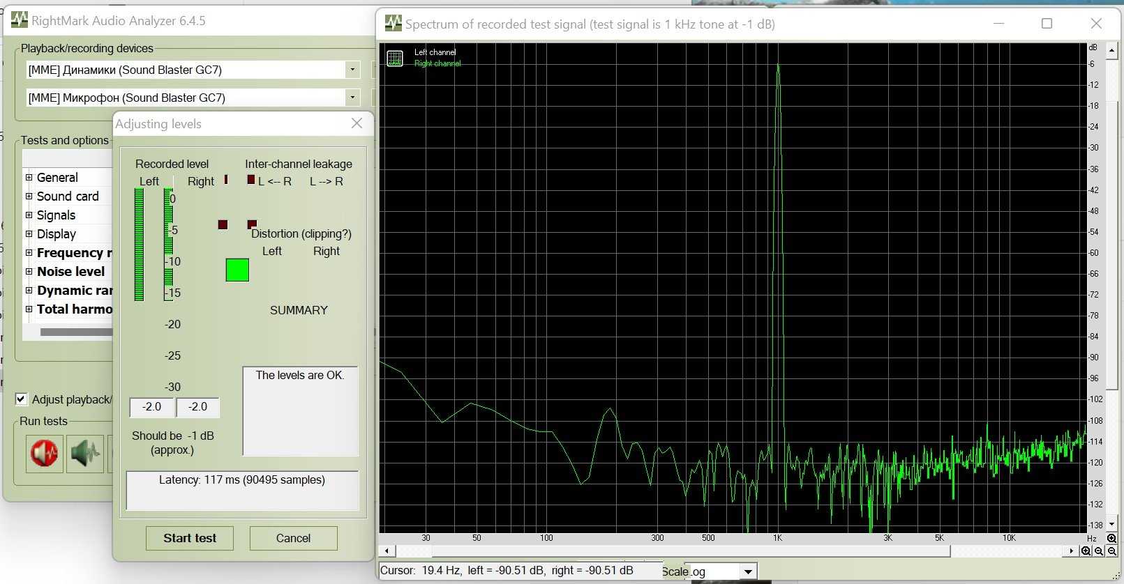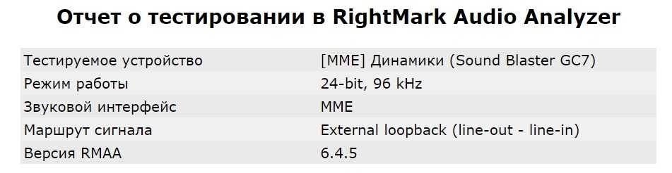 Звуковые характеристики аудиокарты измерялись в программе Right Mark Audio Analyzer 6.4.5. Настройки по умолчанию, изменялся только режим «один канал записи» или «два». Тесты прогонялись несколько раз при разных настройках уровня громкости и записи.