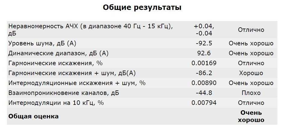 Наилучшие показатели были получены в режиме 24-бит 96 кГц. Общая оценка — «Очень хорошо». По трем пунктам карта получила оценку «Отлично». Плохую оценку за взаимопроникновение каналов не нужно учитывать, тест был в монорежиме.