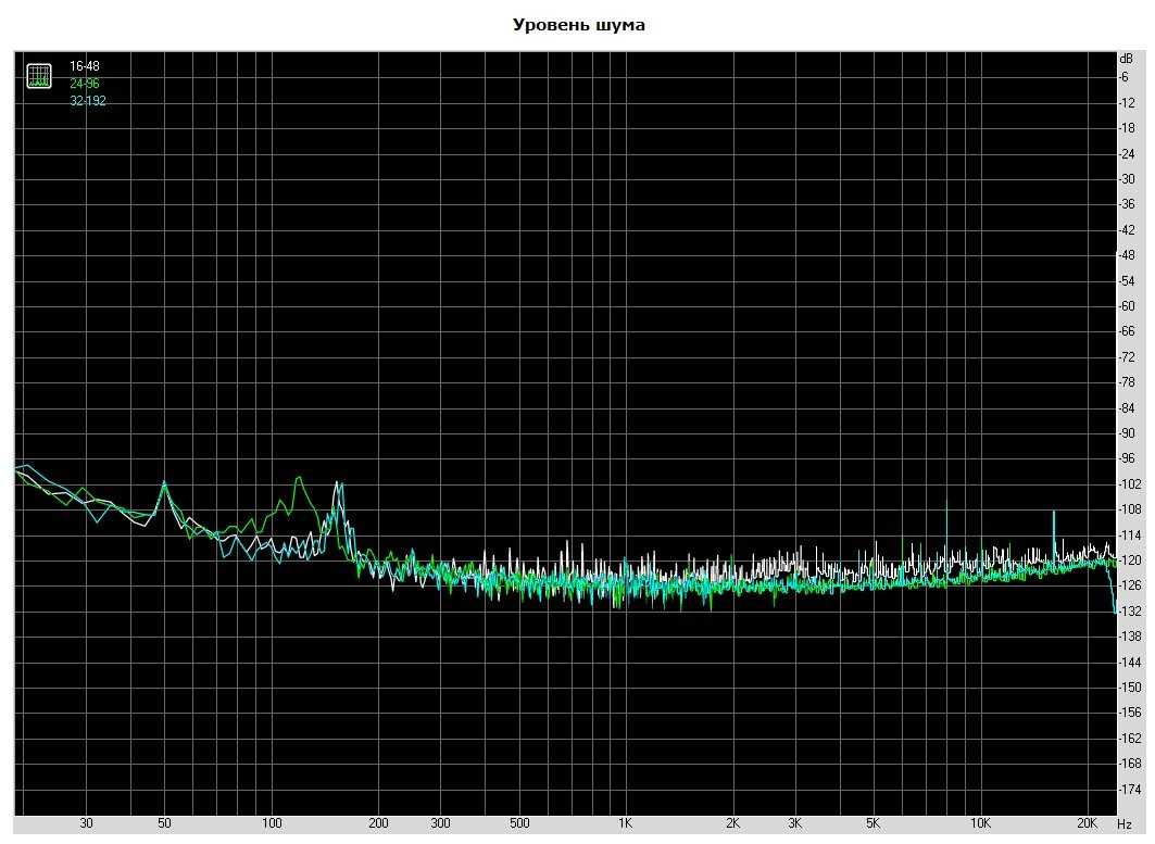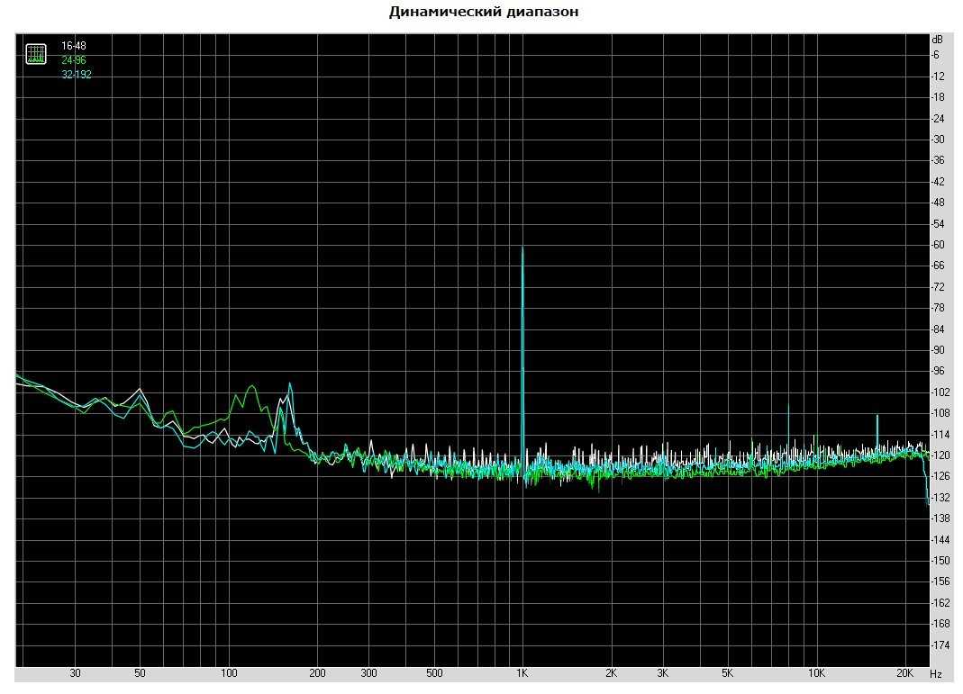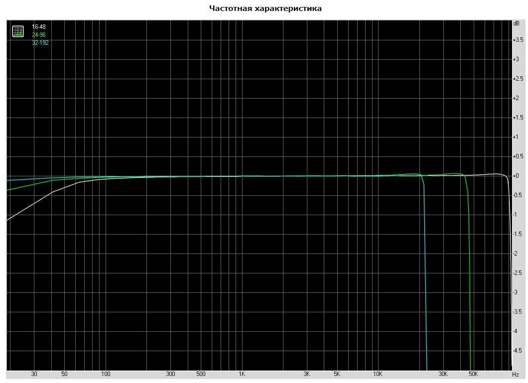 Сравнение работы карты в разных режимах (16 бит 48 кГц, 24 бит 96 кГц, и 32 бит 192 кГц) продемонстрировали практически идентичные результаты. Единственное, присутствует спад АЧХ на низких частотах в режиме 16 бит 48 кГц.