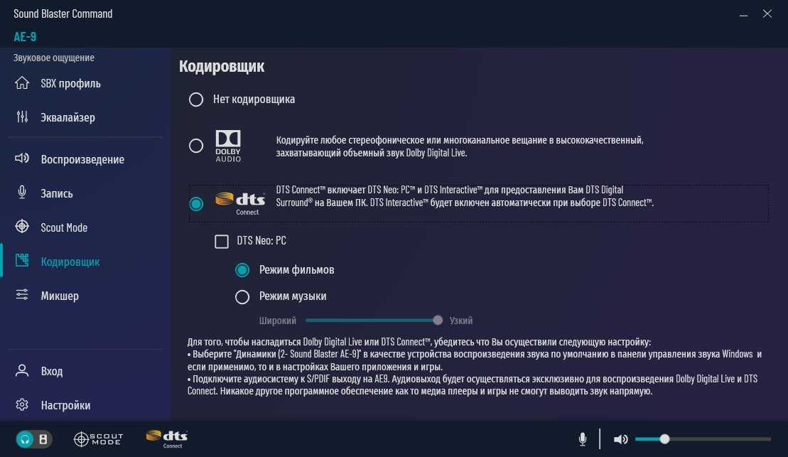 Режим «кодировщик» стал еще одним «жирным» плюсом к плате AE-9. Без забот, но с небольшой возней, можно насладиться работой любого из форматов Dolby Digital Life или DTS connect практически в реальном времени. Теперь владельцы AV-ресиверов могут получить на 5.1 колонки отличный звук с обработкой на карте.